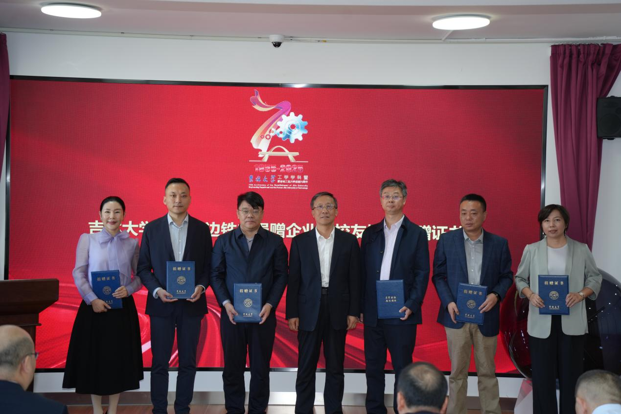 在随后的捐赠环节,校企合作与员工捐赠同步开展。沃尔沃建筑设备(中国)有限公司捐赠两台总价值30万元的D5E型发动机,用于实践教学与科研攻关;吉林寰旗科技有限公司向校庆捐赠价值10.5万元的LED屏祝福展播资源。员工捐赠方面,江西金黄光科技集团董事长杨俊宁员工捐赠价值20万元校园照明设备;北京华兴联投科技董事长马道松员工捐赠10万元教育基金;江苏卡斯特桥梁构件总经理纪小烨员工捐赠5万元团队建设基金;2003级员工代表集体捐赠106万元支持员工奖助与教学平台升级。